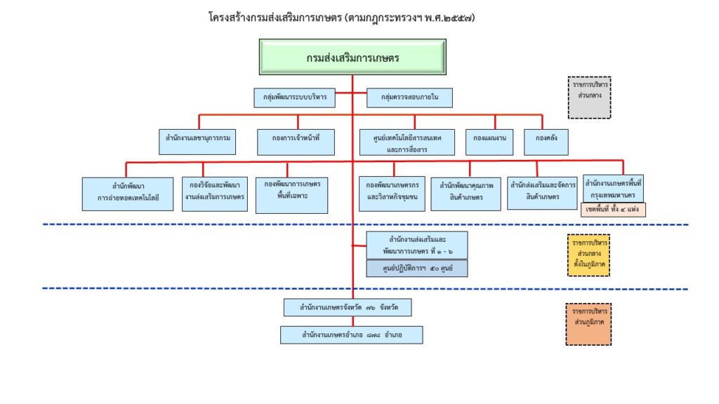 กฎกระทรวงแบ่งส่วนราชการกรมส่งเสริมการเกษตร กระทรวงเกษตรและสหกรณ์ พ.ศ. 2557 ได้กำหนดภารกิจให้กรมส่งเสริมการเกษตรมีภารกิจเกี่ยวกับการส่งเสริมและพัฒนาการเกษตรกร ครอบครัวเกษตรกร องค์กรเกษตรกร และวิสาหกิจชุมชนการส่งเสริมและพัฒนาเพิ่มศักยภาพการผลิต การแปรรูปการเพิ่มมูลค่า การพัฒนาคุณภาพสินค้าเกษตรและผลิตภัณฑ์ โดยการศึกษา วิจัย พัฒนา กำหนดมาตรการและแนวทางในการส่งเสริมการเกษตร ตลอดจนการถ่ายทอดเทคโนโลยีการเกษตร และการให้บริการทางการเกษตร เพื่อให้เกษตรกรมีอาชีพ และรายได้ที่มั่นคง มีคุณภาพชีวิตที่ดีและพึ่งพาตนเองได้อย่างยั่งยืน