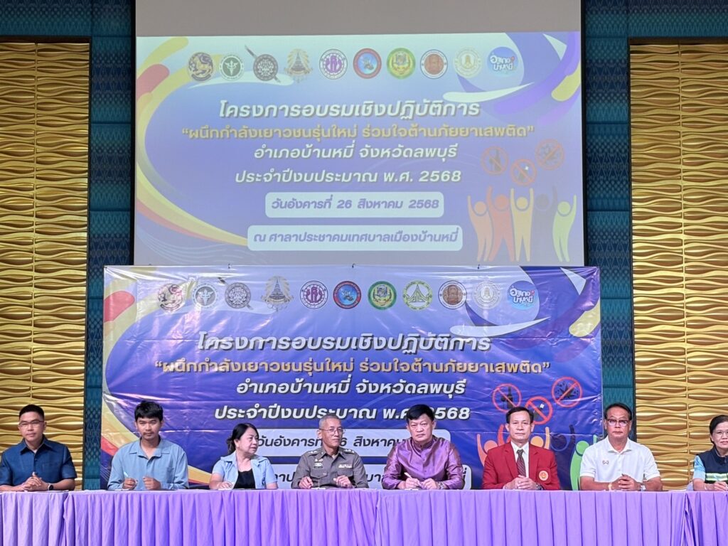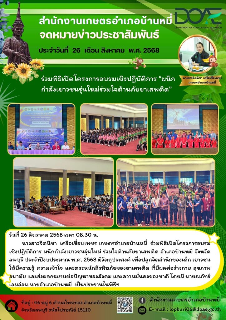 นางสาวจิตนิชา เครือเขื่อนเพชร เกษตรอำเภอบ้านหมี่ ร่วมพิธีเปิดโครงการอบรมเชิงปฏิบัติการ ผนึกกำลังเยาวชนรุ่นใหม่ ร่วมใจต้านภัยยาเสพติด อำเภอบ้านหมี่ จังหวัดลพบุรี ประจำปีงบประมาณ พ.ศ. 2568 มีวัตถุประสงค์ เพื่อปลูกจิตสำนึกของเด็ก เยาวชนให้มีความรู้ ความเข้าใจ และตระหนักถึงพิษภัยของยาเสพติด ที่มีผลต่อร่างกาย สุขภาพอนามัย และส่งผลกระทบต่อปัญหาของสังคม และความมั่นคงของชาติ โดยมี นายณภัทร์ เอมอ่อน นายอำเภอบ้านหมี่ เป็นประธานในพิธีฯ