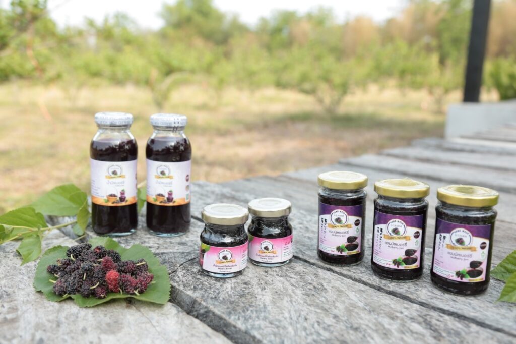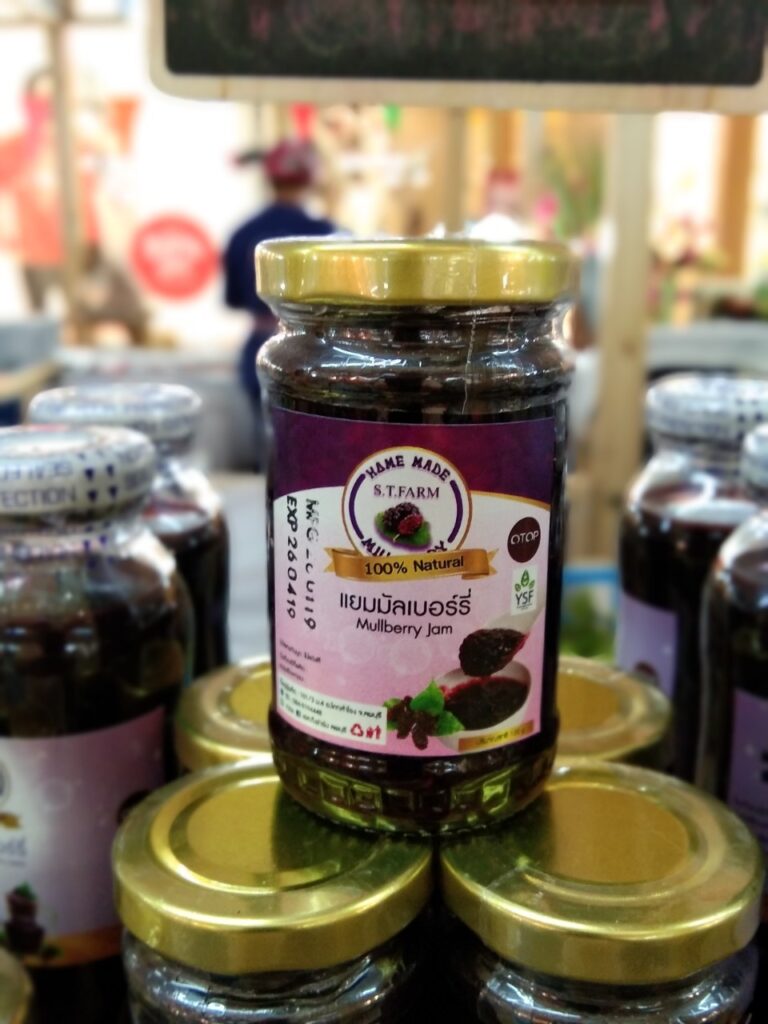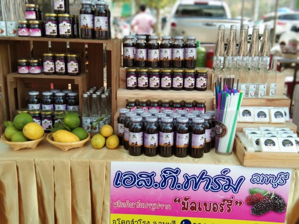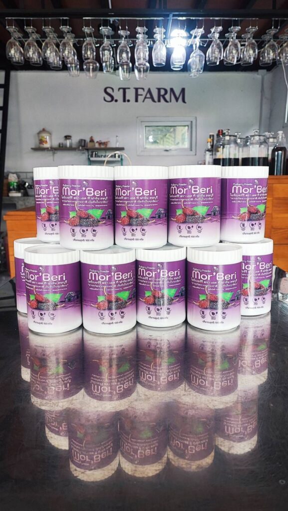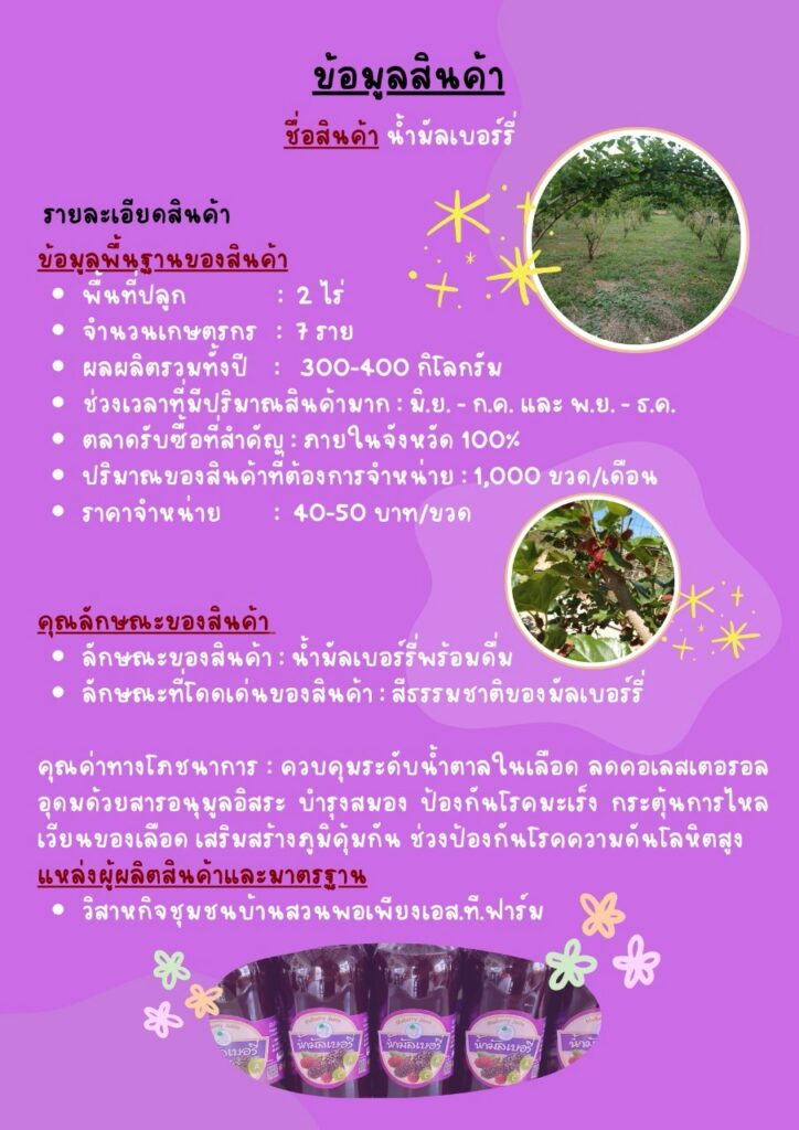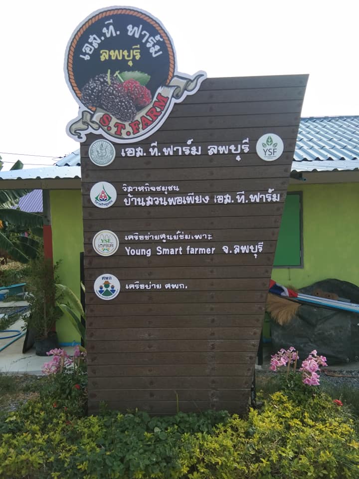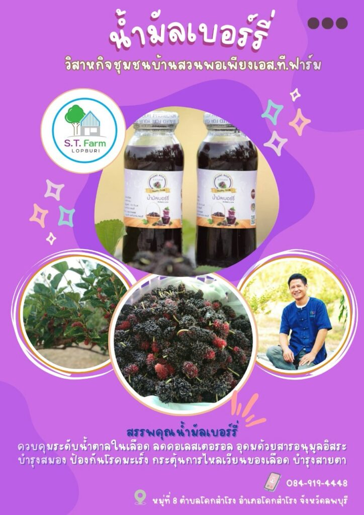 วิสาหกิจชุมชนบ้านสวนพอเพียง เอส.ที.ฟาร์ม เกิดจากการรวมตัวของเกษตรกรที่ชื่นชอบการทำเกษตรกรรมแบบธรรมชาติ ปราศจากการใช้สารเคมี สินค้าหลักของวิสาหกิจชุมชน คือ มัลเบอร์รี่ เมล่อน และมะนาว โดยมุ่งเน้นการเพิ่มมูลค่าสินค้าเกษตร โดยการแปรรูป สินค้าที่สำคัญของวิสาหกิจชุมชน ได้แก่ น้ำมัลเบอร์รี่ น้ำมัลเบอร์รี่สกัดเข้มข้น น้ำมัลเบอร์รี่ผสมเสาวรส แยมมัลเบอร์รี่ ซอสมัลเบอร์รี่ โยเกิร์ตซอสมัลเบอร์รี่ ทาร์ตมัลเบอร์รี่ ทั้งนี้วิสาหกิจชุมชนต้องการจำหน่ายสินค้าส่งตรงถึงมือผู้บริโภค โดยไม่ผ่านพ่อค้าคนกลางเพื่อความสดใหม่ของสินค้า และราคาที่เป็นธรรม พร้อมกันนี้ยังมุ่งเน้นการพัฒนาสินค้าให้ผ่านการรับรองมาตรฐานอีกด้วย