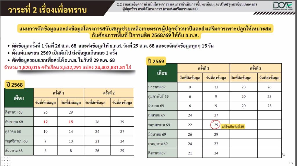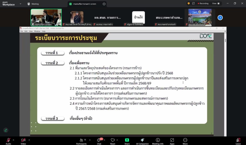 วันที่ 4 กันยายน 2568 นางมัลลิกา กว๊ะ เกษตรอำเภอโคกสำโรง พร้อมด้วยเจ้าหน้าที่สำนักงานเกษตรอำเภอโคกสำโร เข้าร่วมประชุมชี้แจงโครงการสนับสนุนเงินช่วยเหลือเกษตรกรผู้ปลูกข้าวนาปรัง ปี 2568 และโครงการสนับสนุนช่วยเหลือเกษตรกรผู้ปลูกข้าวนาปีและส่งเสริมการเพาะปลูกให้เหมาะสมกับศักยภาพพื้นที่ ปีการผลิต 2568/69 ผ่านระบบออนไลน์ Zoom Meeting ณ สำนักงานเกษตรอำเภอโคกสำโรง จังหวัดลพบุรี